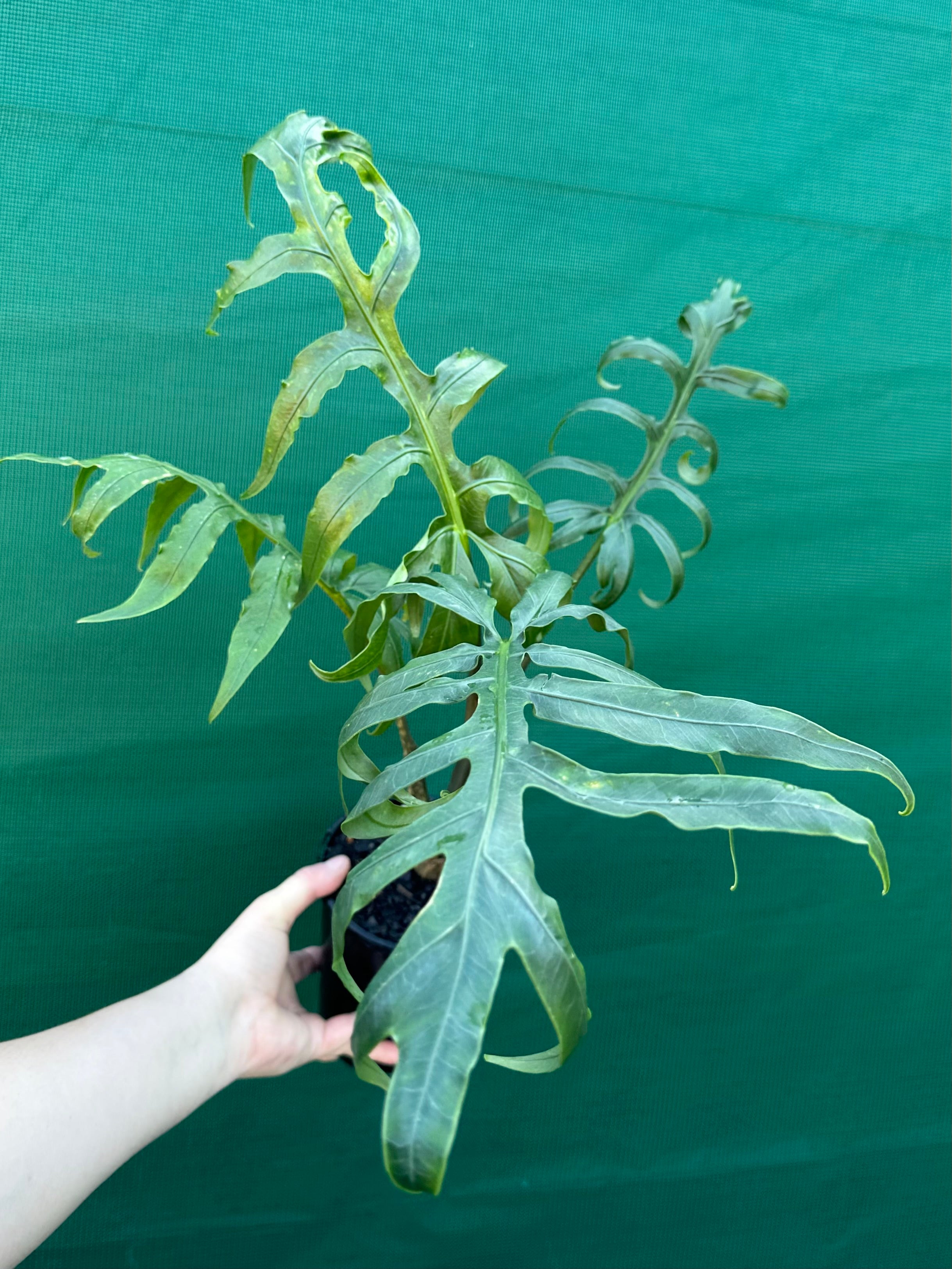 Alocasia brancifolia is a stunning species native to the Moluccas and New Guinea and is commonly called ‘Serpents Tail’ in reference to its unique leaf shape. It has deep green coloured leaves that can grow to be very large, with narrow and undulating, dissected leaves. The stems on this alocasia almost resemble stripes with shades of green and brown, adding to the visual appeal of this plant.