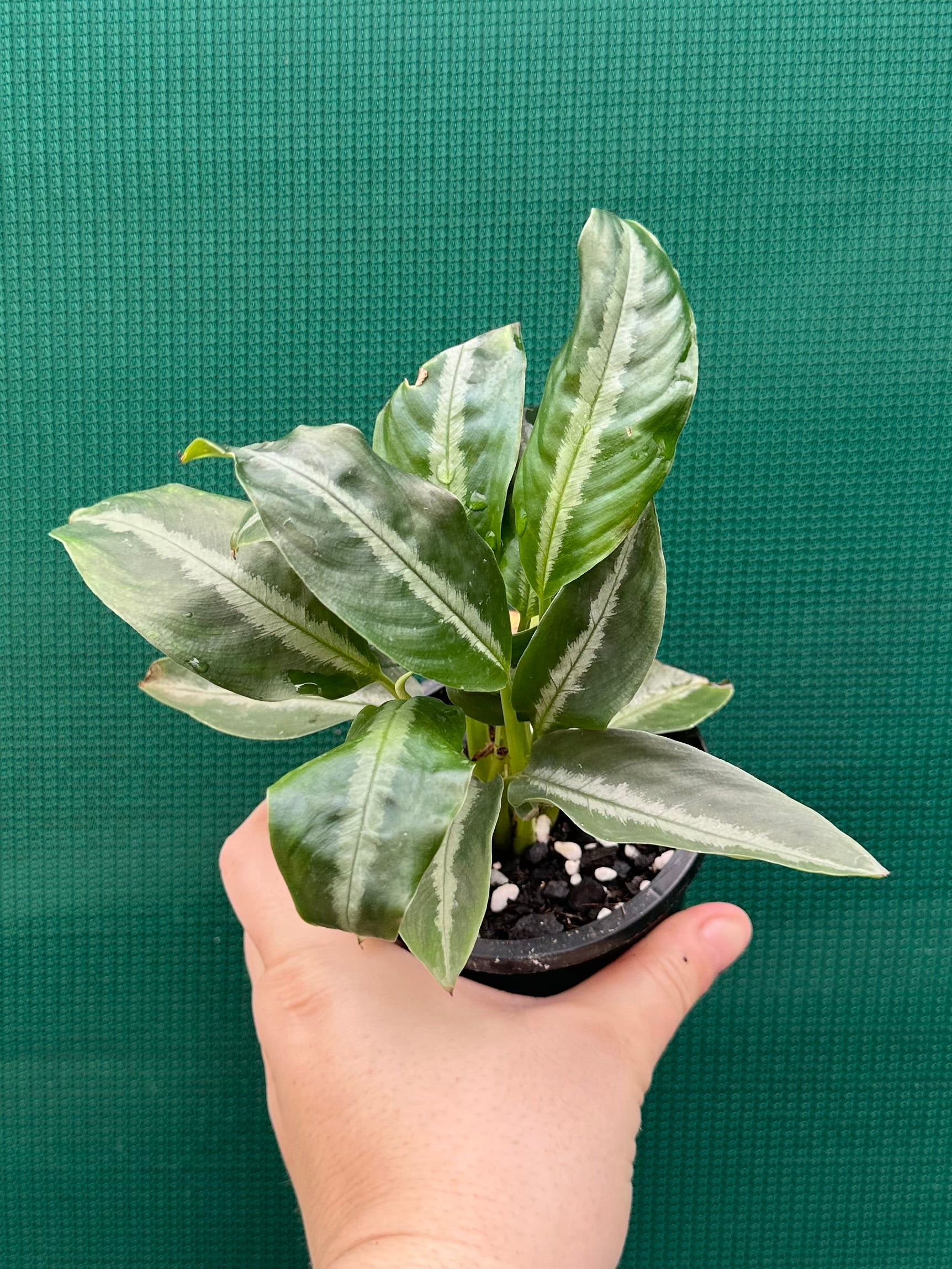 This fun plant has silver and green patterned foliage. The Schismatoglottis stays compact as it matures, making it perfect for any lit place indoors.