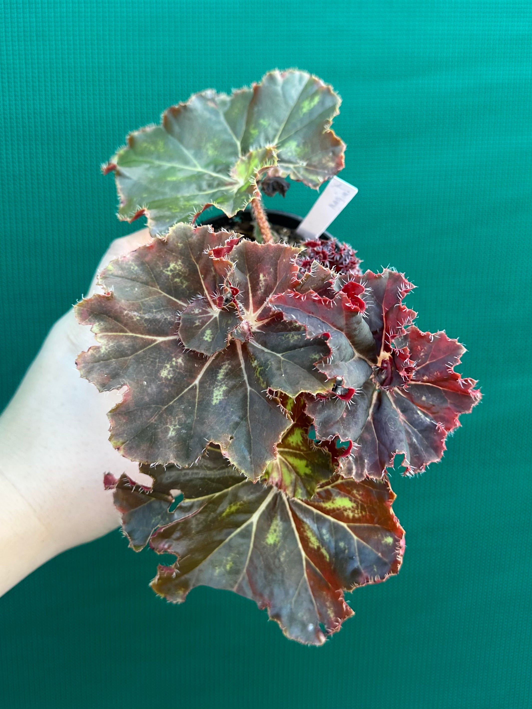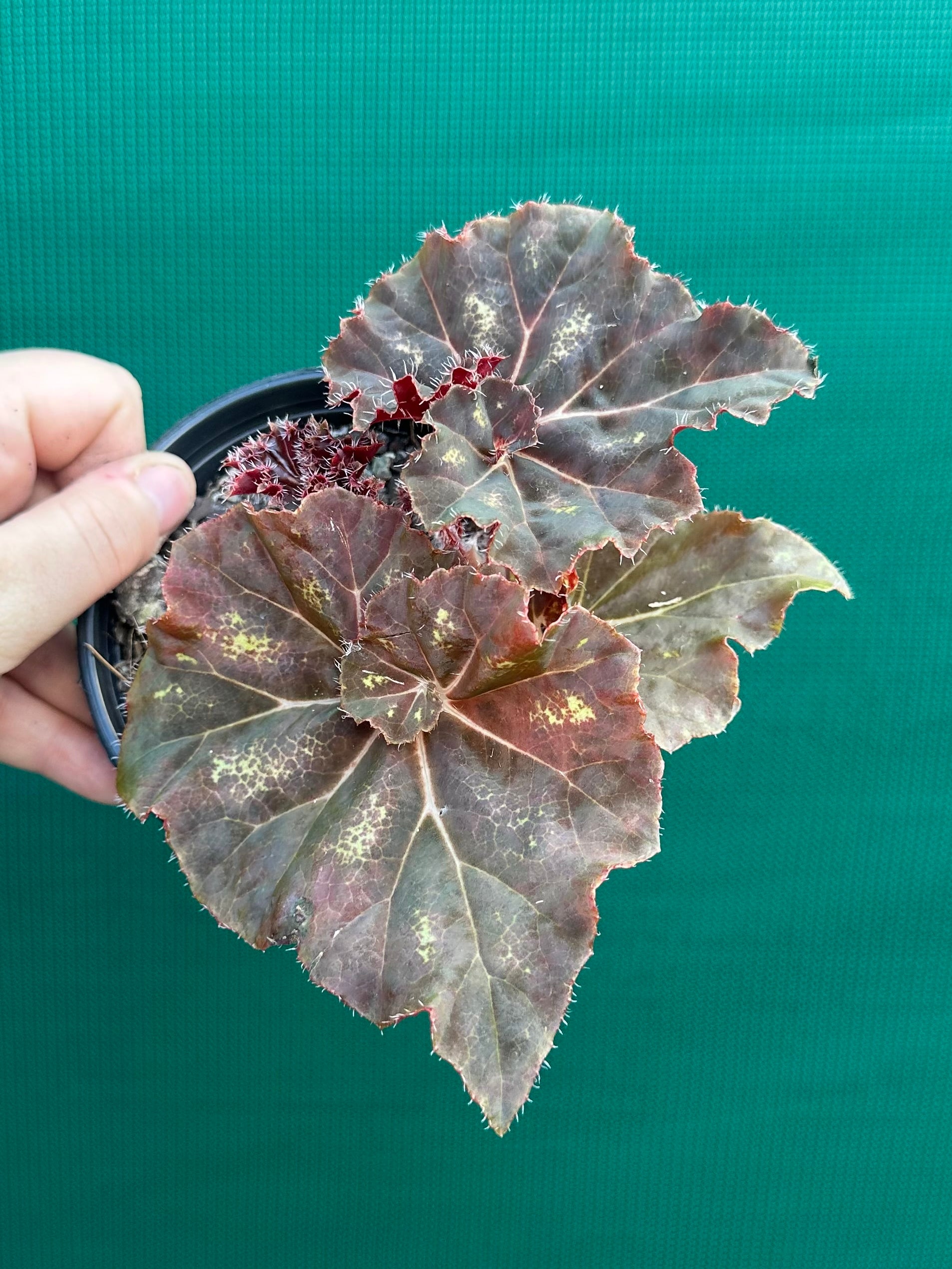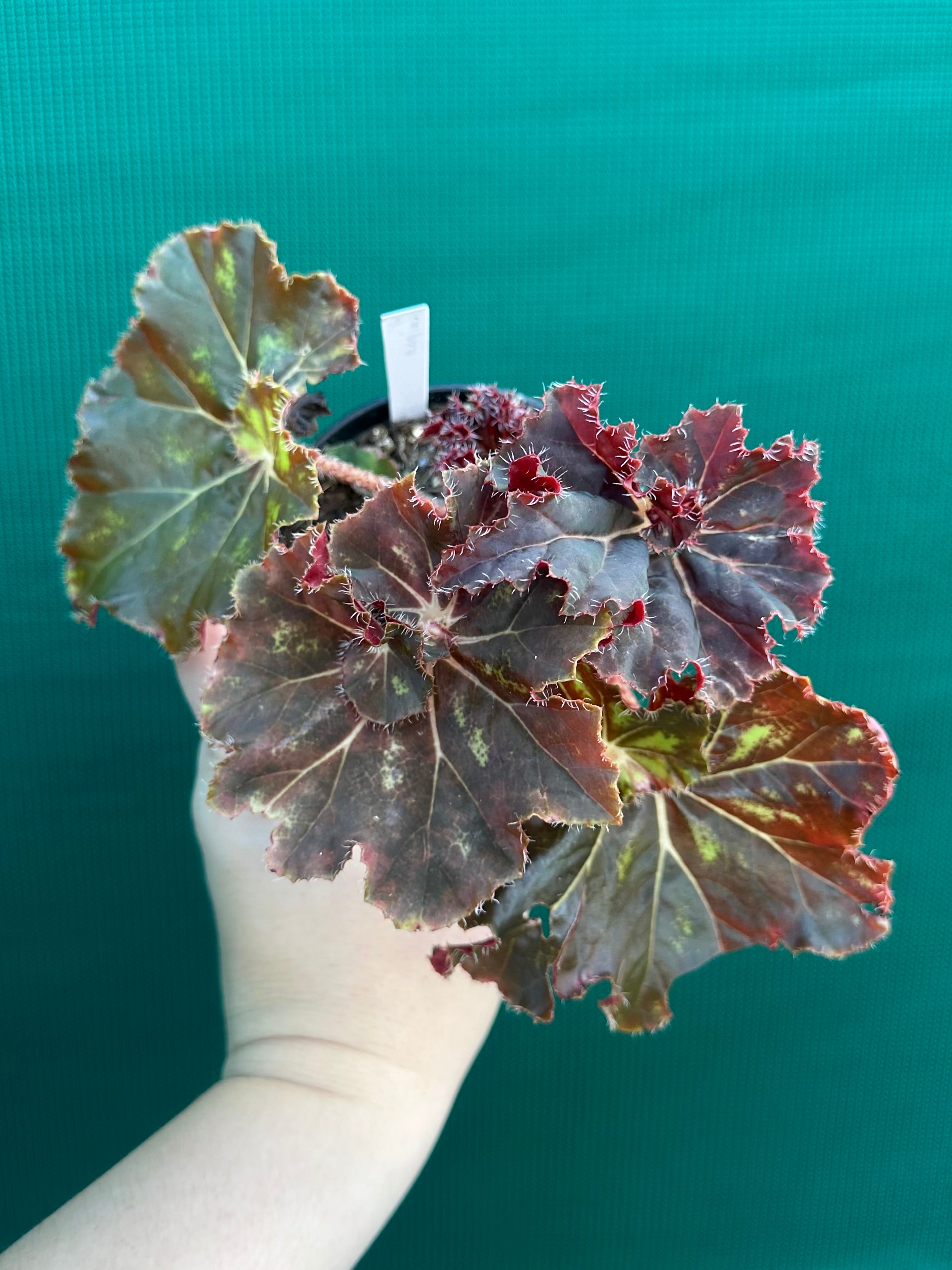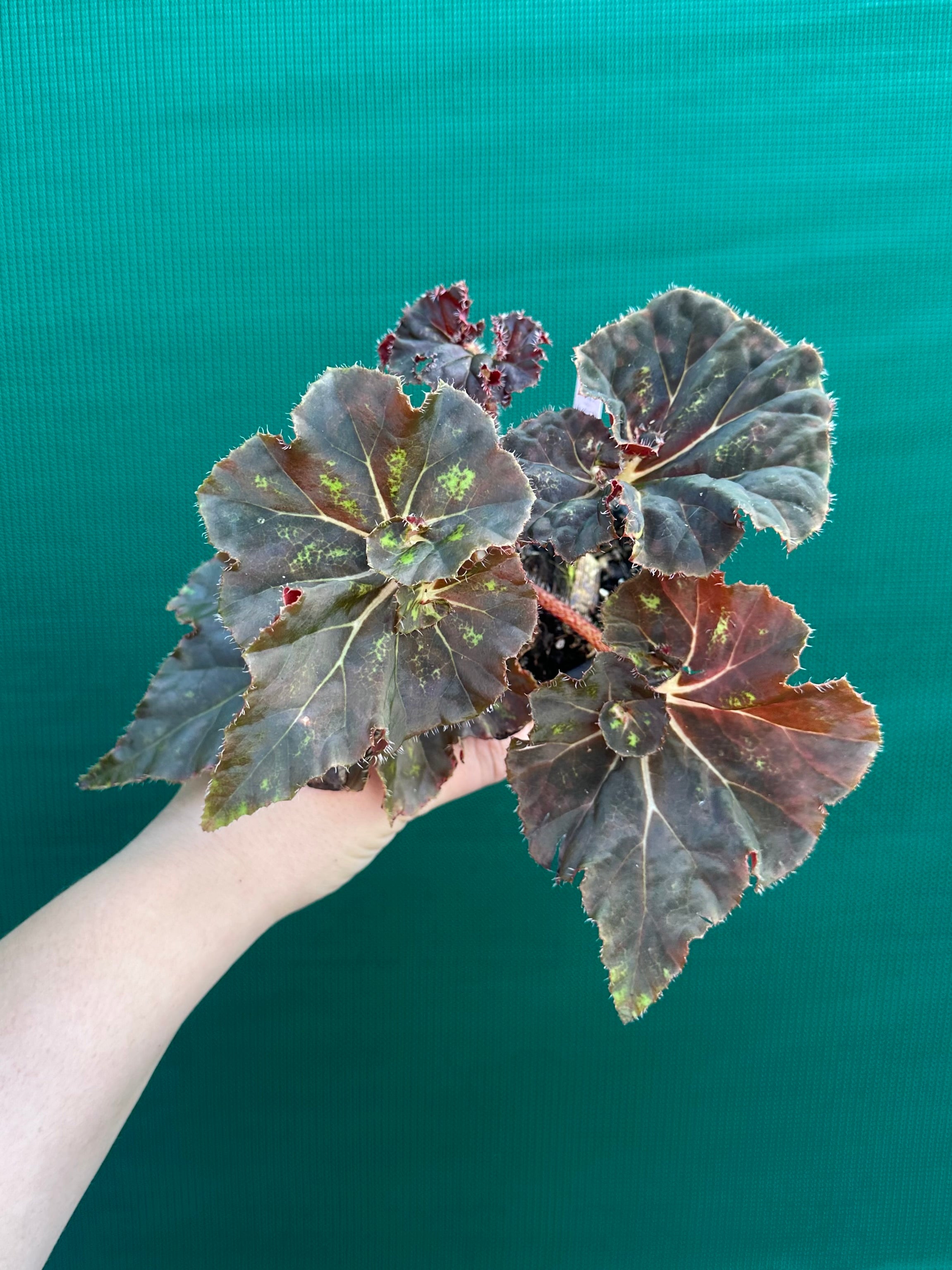 Begonias are robust plants; they come in many sizes, colours and leaf shapes, and bear flowers for many months. This Begonia is sure to be an eye catcher with its stunning foliage.