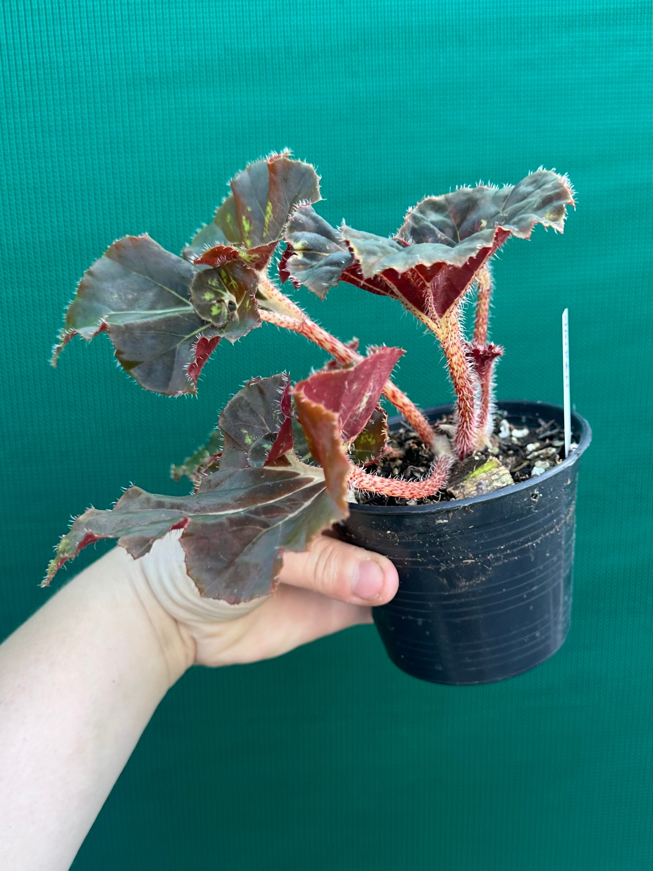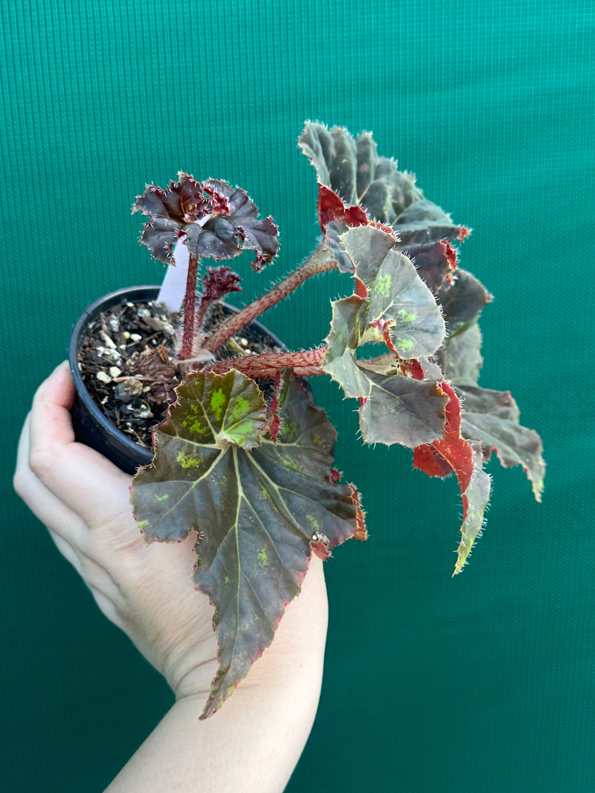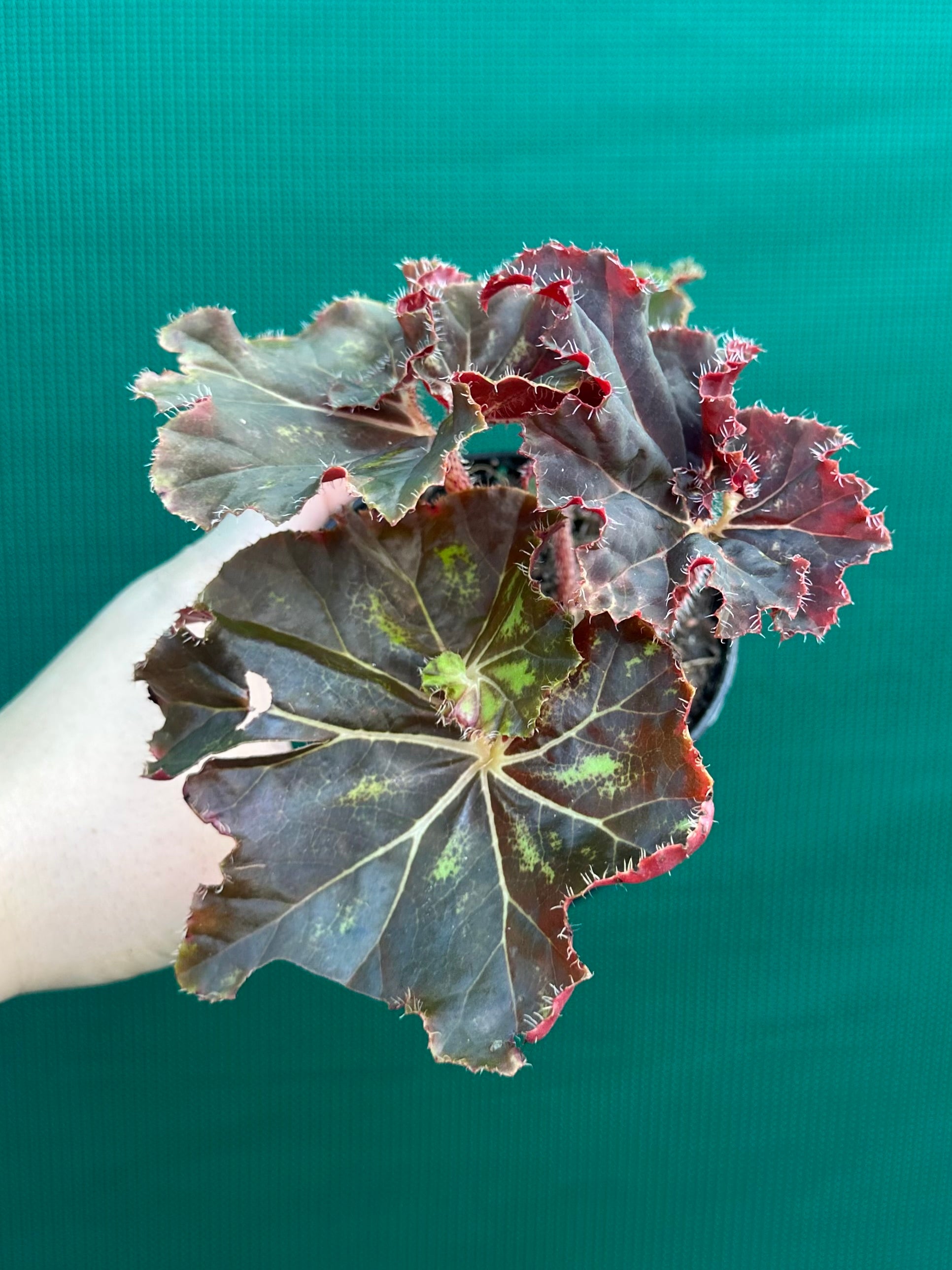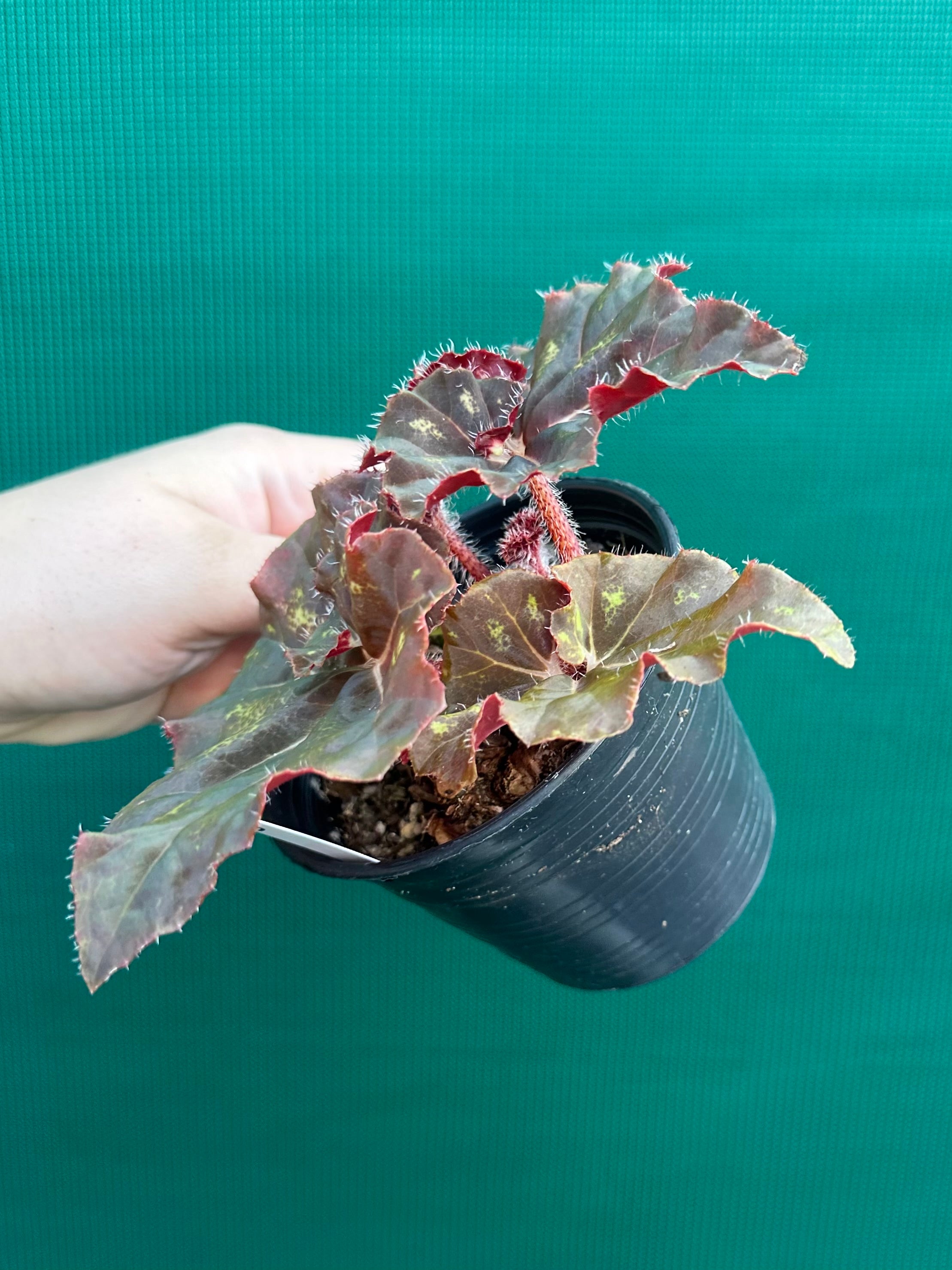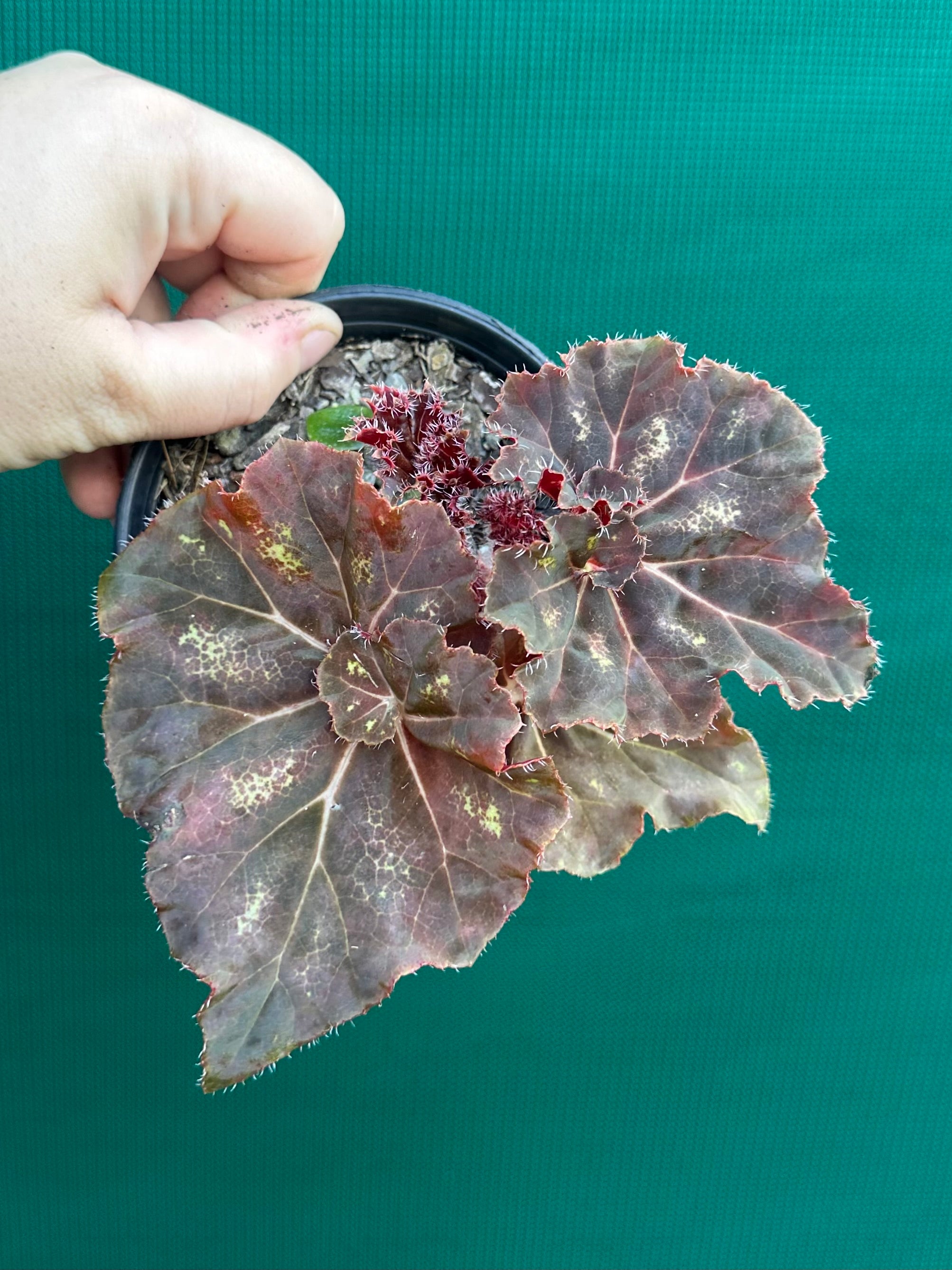 Begonias are robust plants; they come in many sizes, colours and leaf shapes, and bear flowers for many months. This Begonia is sure to be an eye catcher with its stunning foliage.