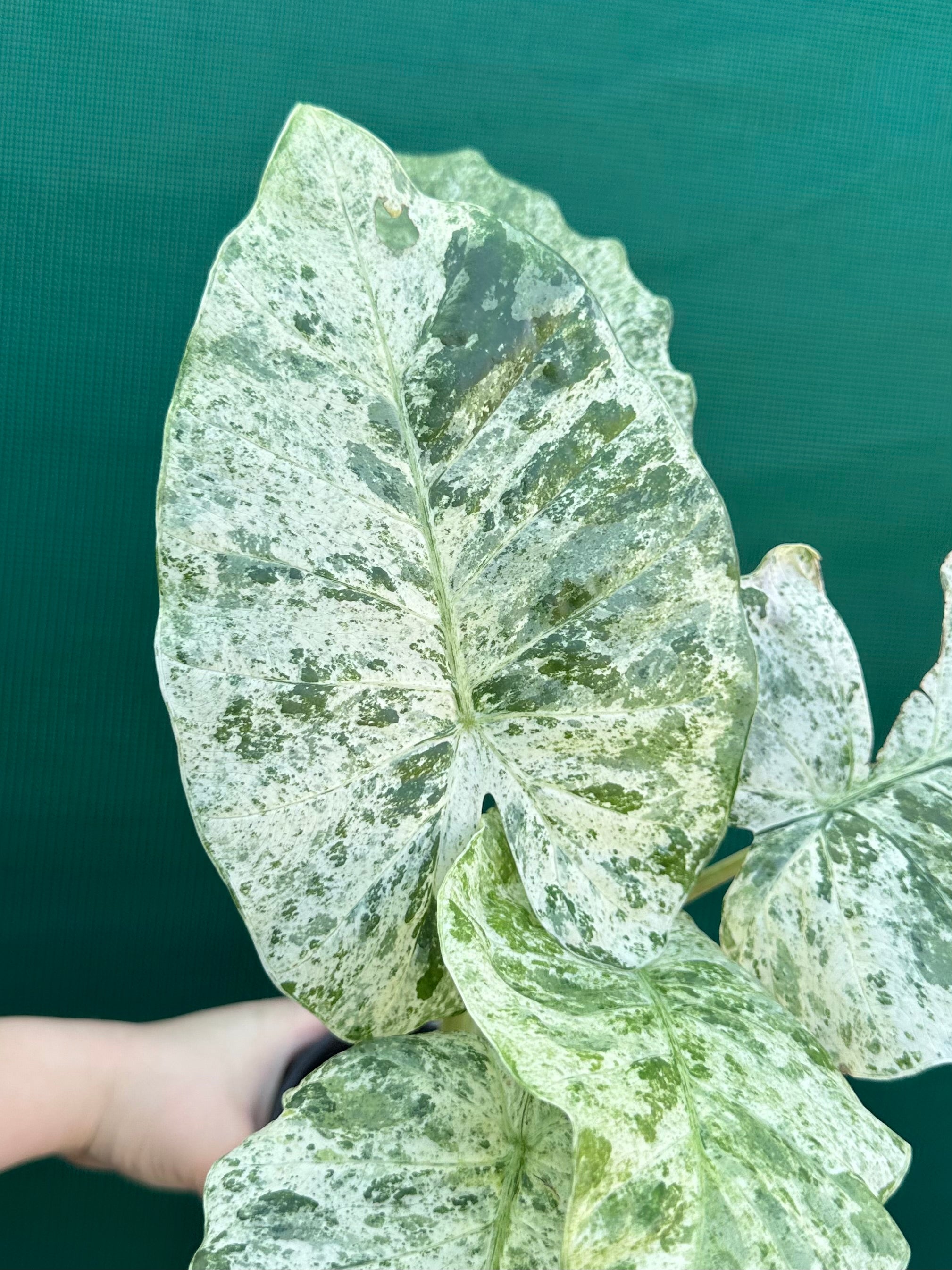 This stunner grows to be the most amazing statement piece in any collection! Other common names include Alocasia 'Batik', 'Camouflage', or 'Splash' and regardless of the name used this beauty will give you different minty variegation on every leaf.
