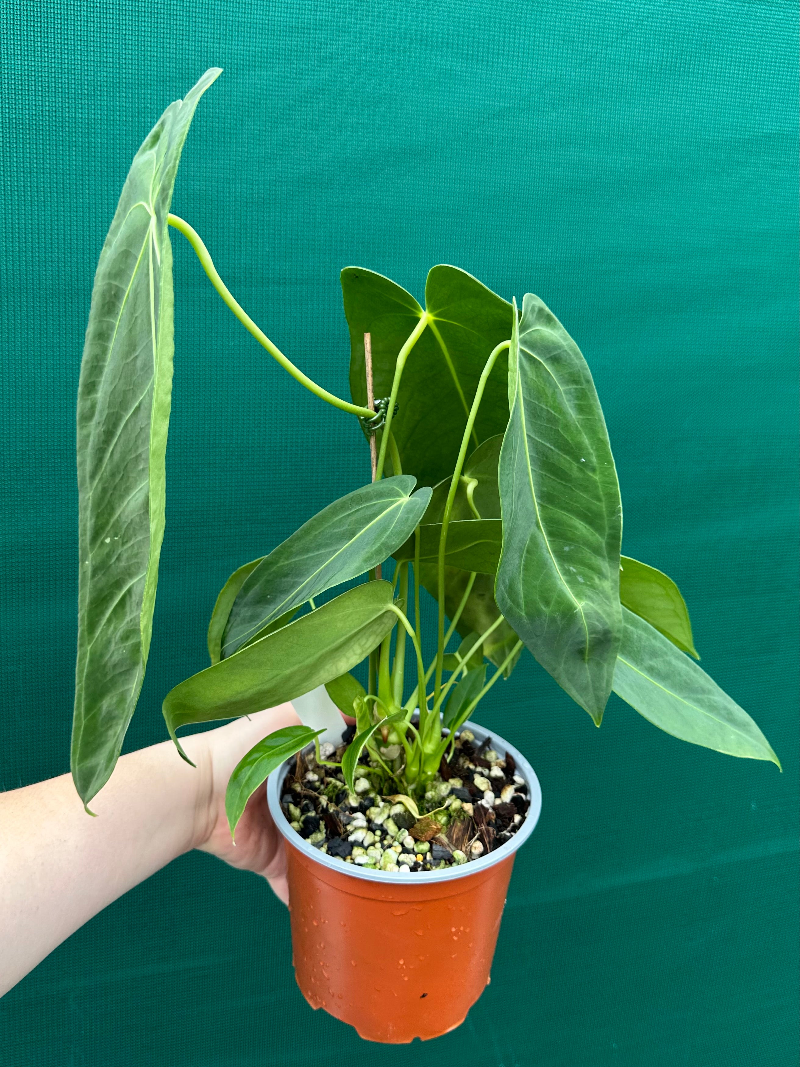 These large leafy Anthuriums favor plenty of bright, indirect light. Due to its tropical roots, these Anthuriums adore moist soil. However, it should never sit in soggy, water-logged soil, as it encourages stress and the proliferation of diseases. Potting medium should be well draining, while keeping it moist, airy, and light.