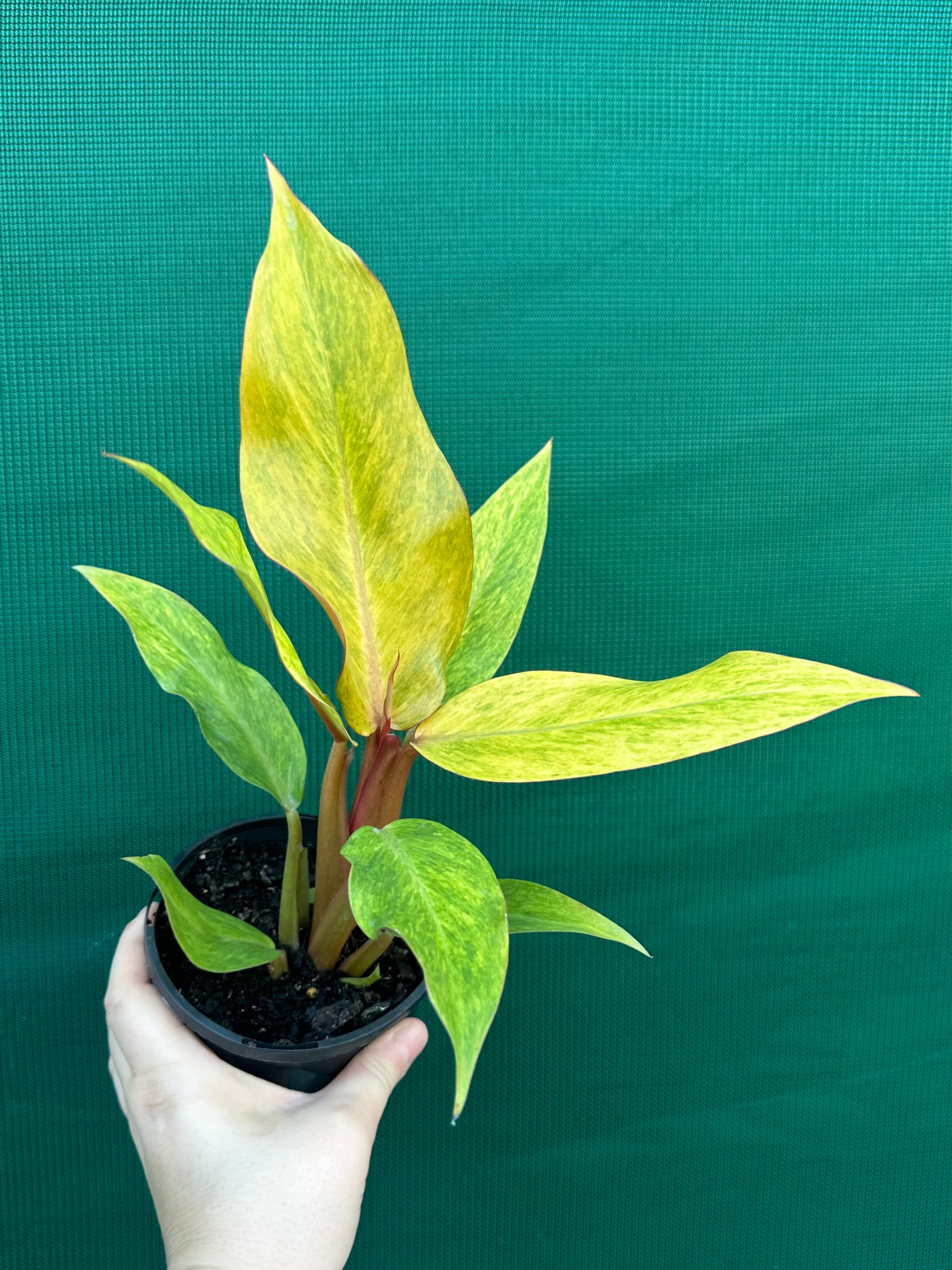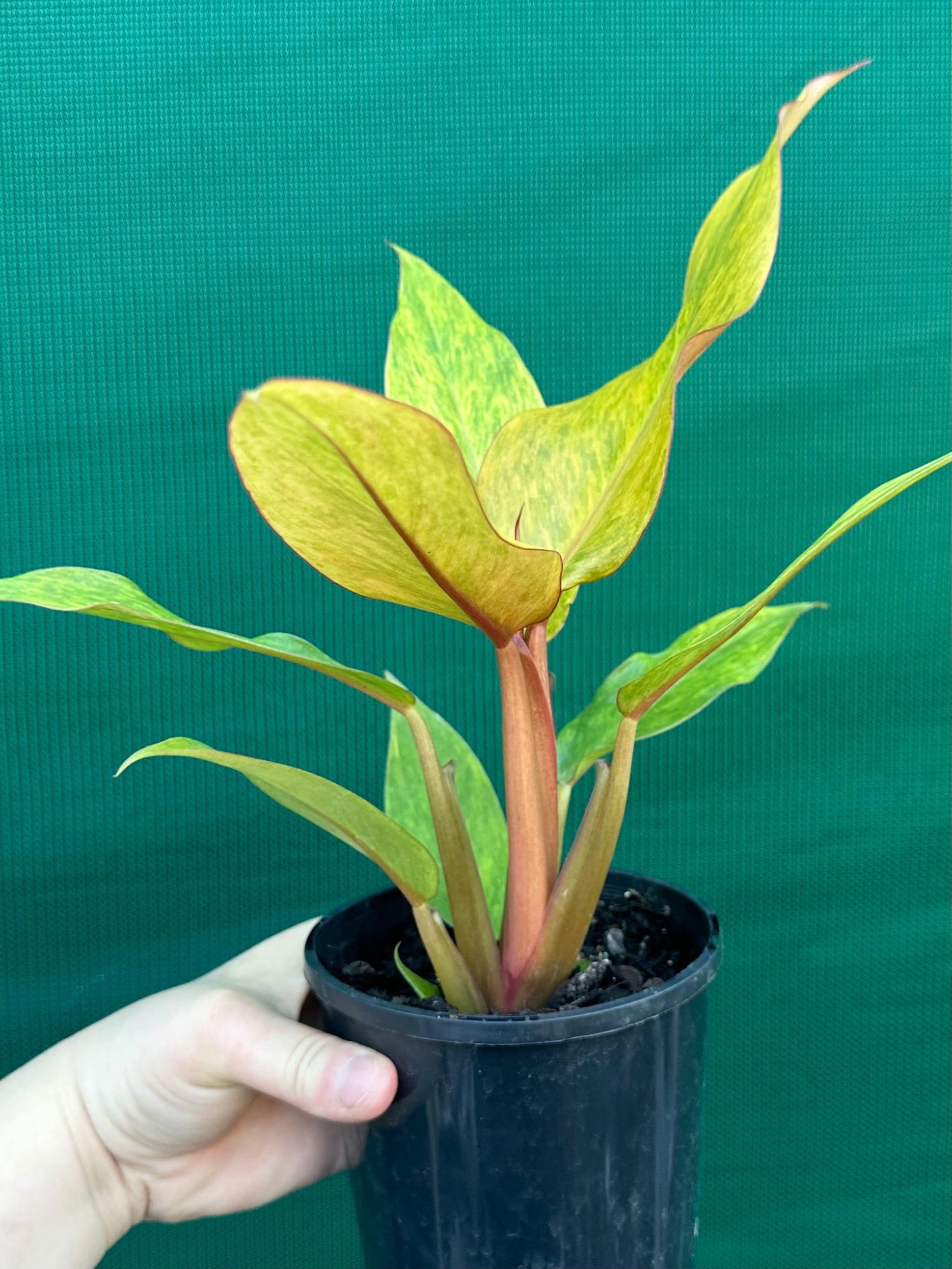 Philodendron ‘Orange Marmalade’ is a stunning plant with loud, bold foliage. The long, heart shaped leaves that emerge a vibrant coppery orange and gradually mature into a a mottled variegation with different shade of light green and yellow. The stem and petioles are pinky-red shade which creates a beautiful contrast against the leaves. These Philodendrons can begin to climb as they mature and look fantastic when grown up a totem pole or other structure.