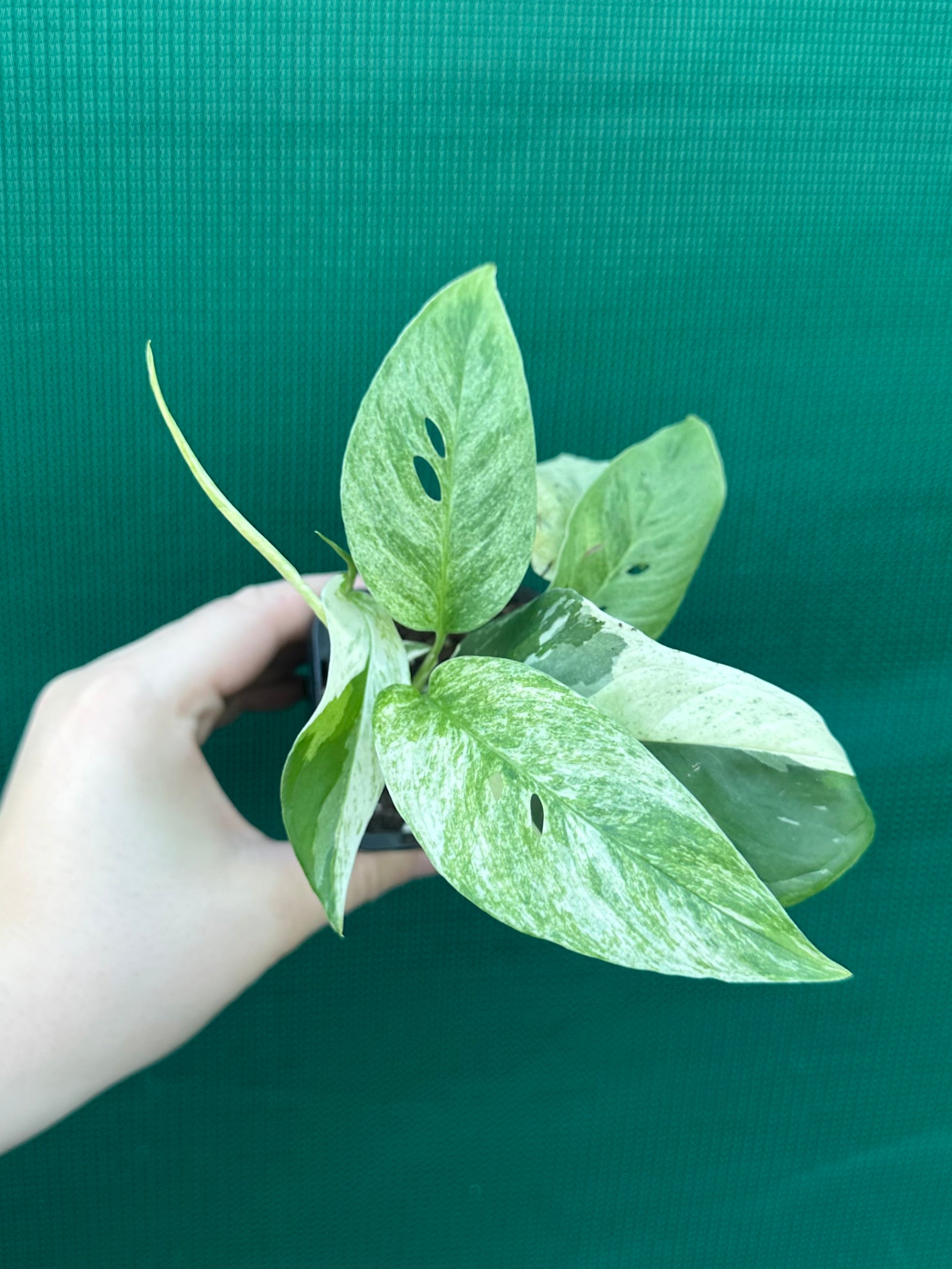 The Variegated Monstera adansonii var laniata is a member of the adansonii species. This beauty is a variegated variety that exhibits magnificent splashes of white and greens, often described as mint variegation. Loved by collectors for its stunning leaves that grow to incredible size with intricate fenestrations. The leaves start out small and lance shaped but grow larger and begin to fenestrate as they climb. Fenestrations refers to the holes in the leaves that will develop as the plant grows into maturity. This is an adaption developed as when in their natural rainforest habitat, fenestrations allow the plant to maximise light exposure to lower leaves. Fenestrations also facilitate water reaching the plants roots. Some theories also suggest that the holes can help the plants withstand strong winds by allowing these essential elements wind to pass through the leaves with no tearing. This increased airflow is believed to help keep the plants cool in extremely humid rainforests.
