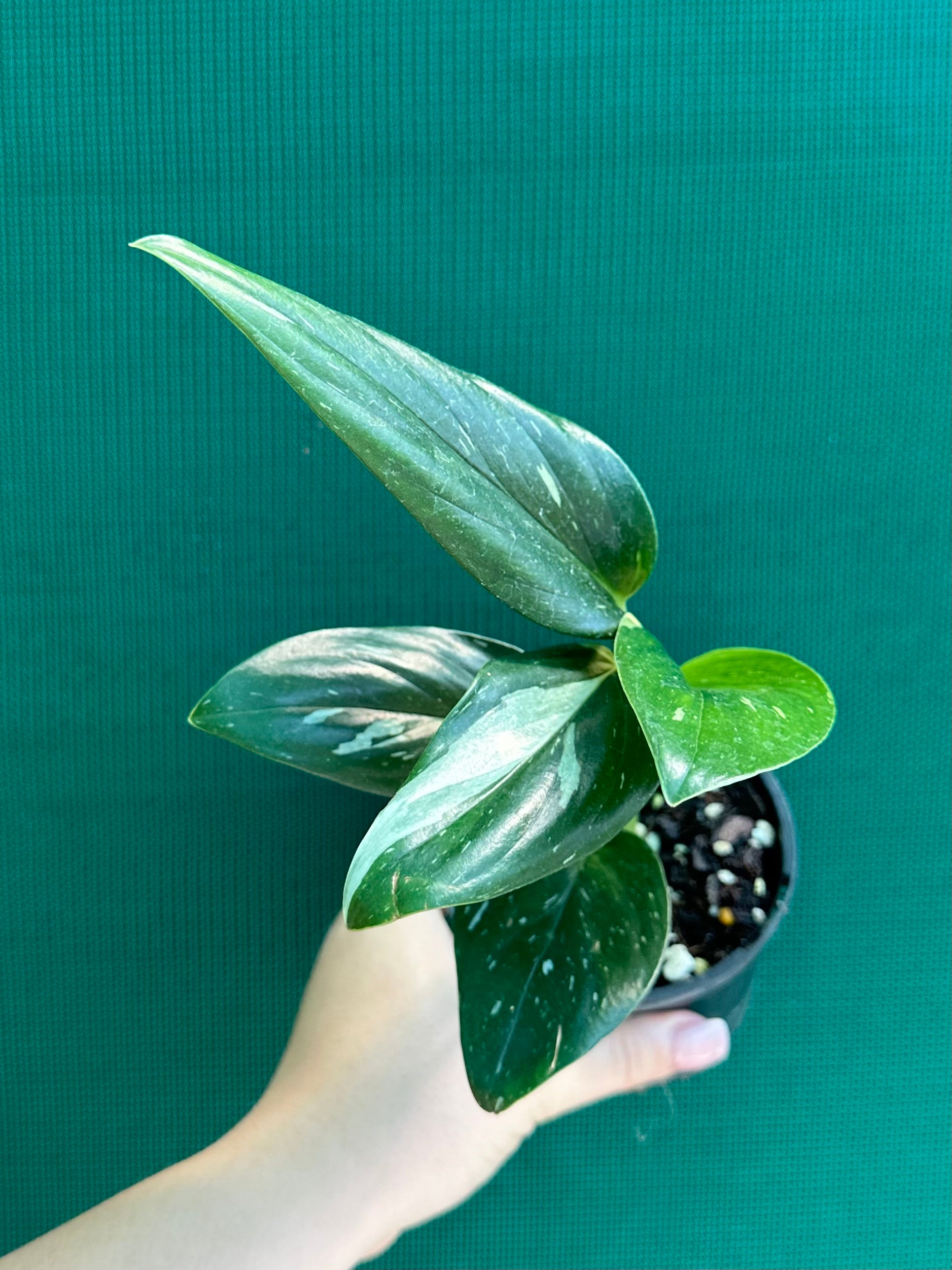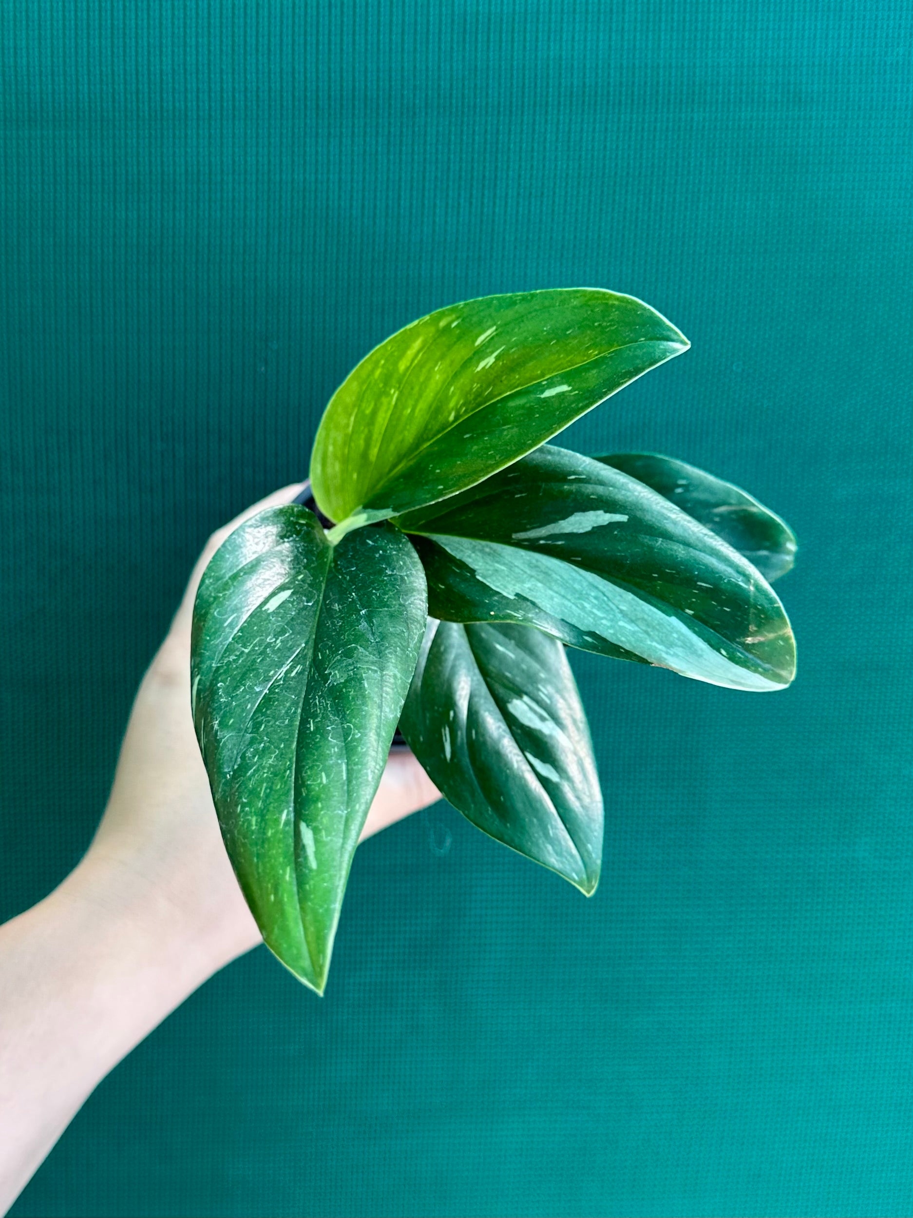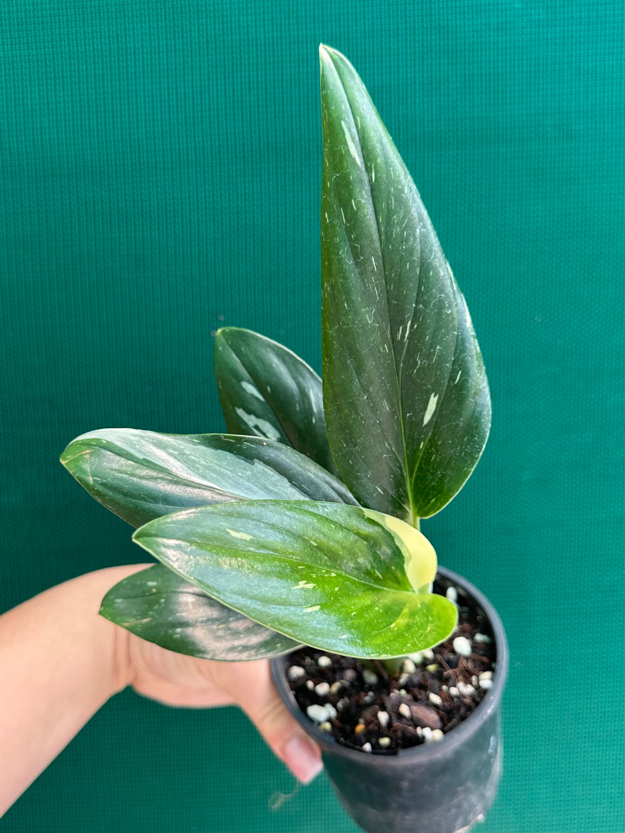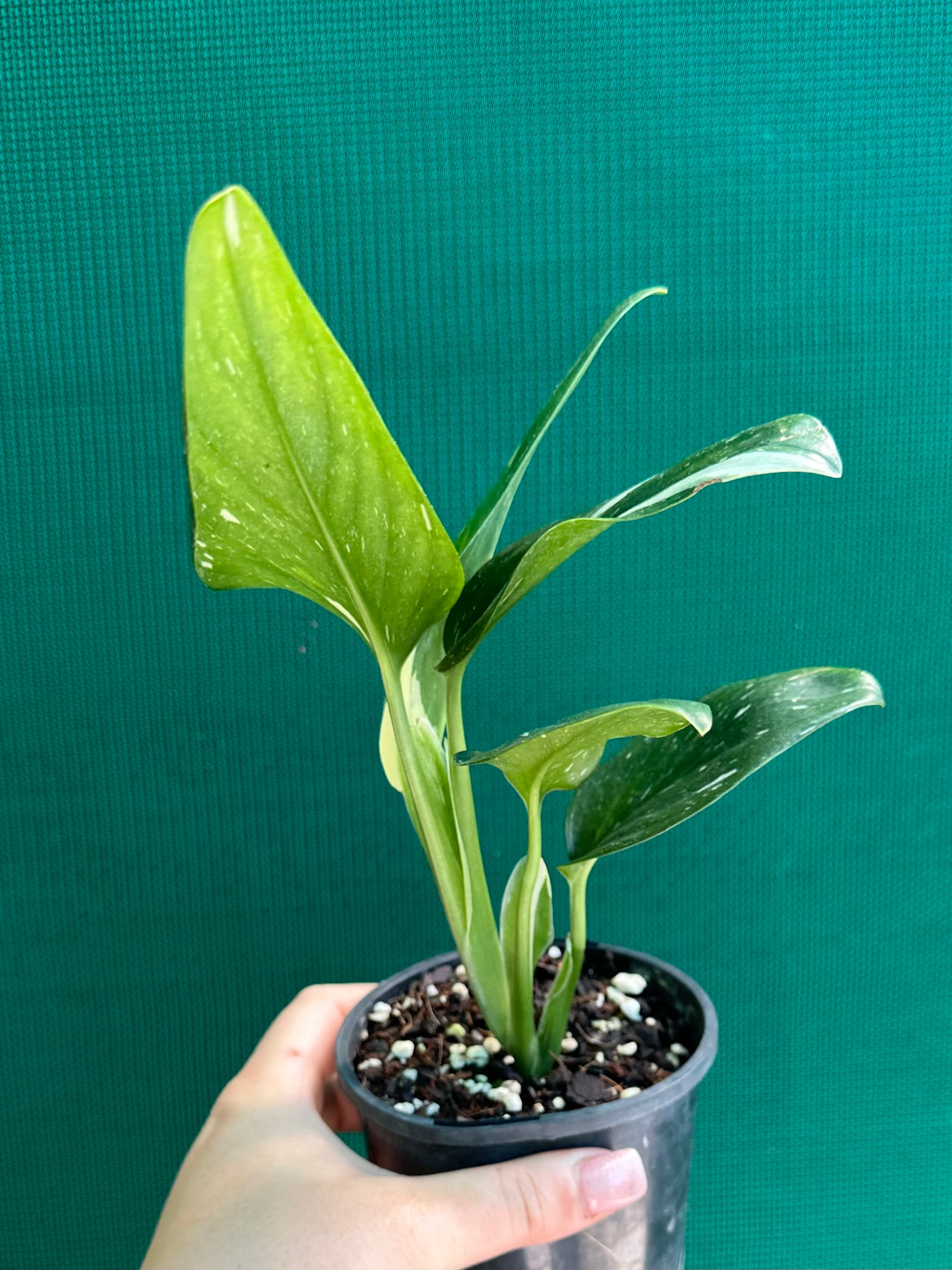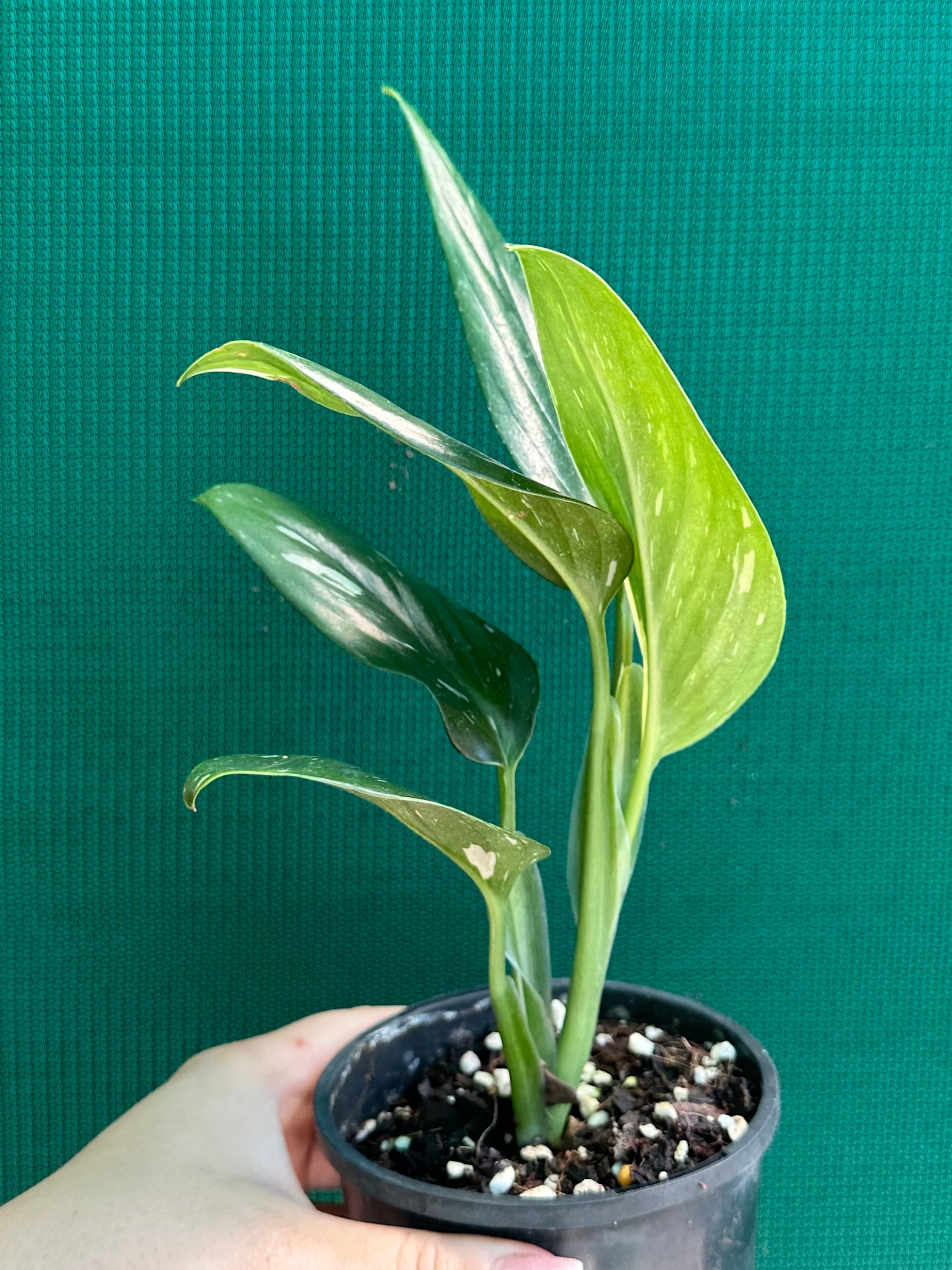 This species of Monstera does not develop fenestrations (holes) in the leaves as it matures. Instead it has lance shaped leaves that are a beautiful glossy green with variable white variegation.